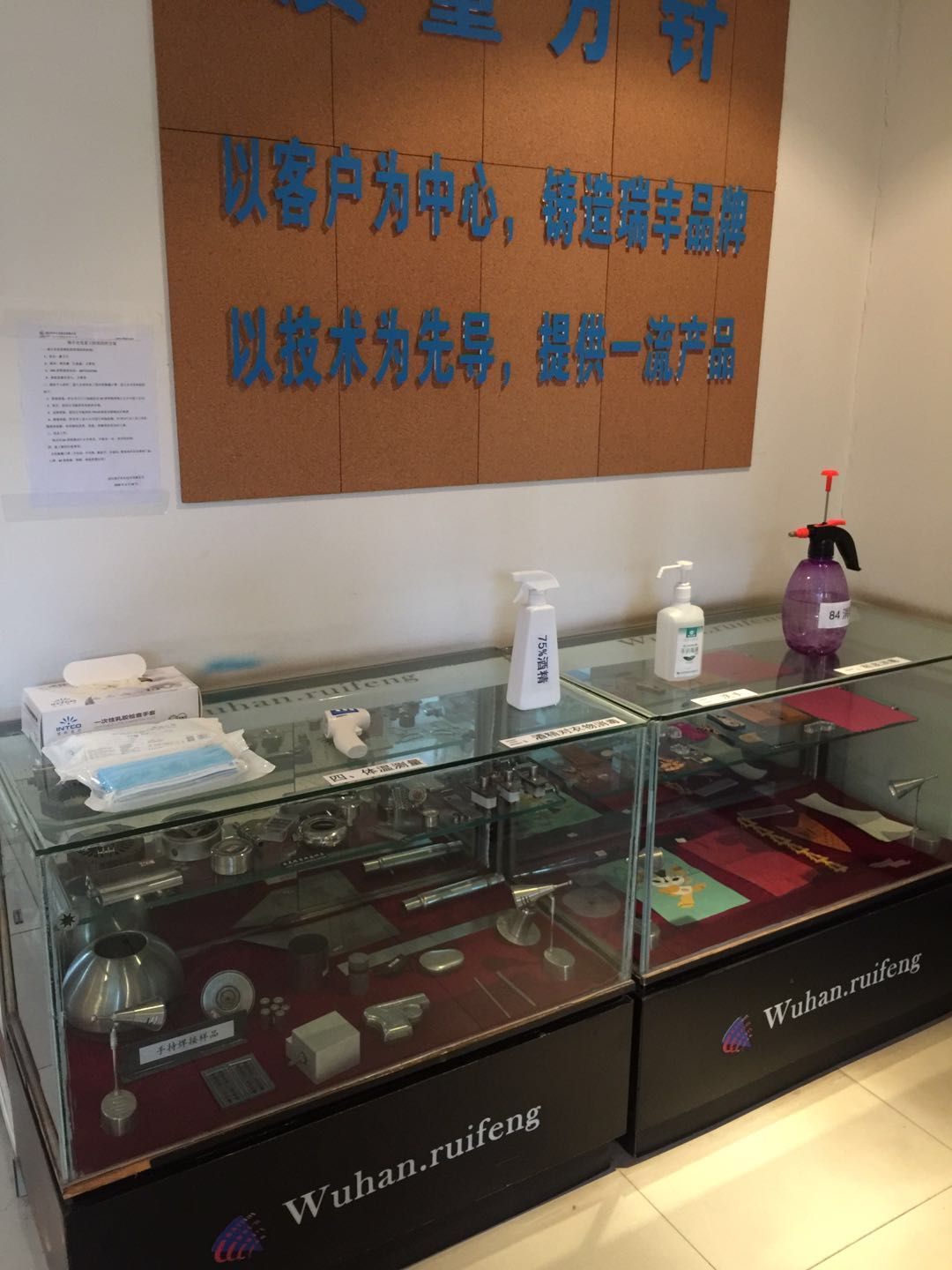 公司準(zhǔn)備了充足的防疫物資:消毒水、酒精、口罩、體溫槍、手套等。